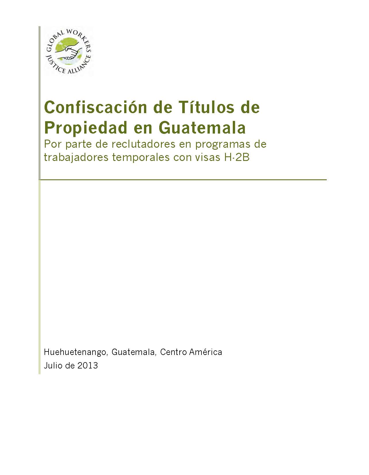 Este informe de la organización Global Workers Justice Alliance sobre Reclutamiento y Abuso en los programas de Visa Temporales al Exterior, llama atención y denuncia públicamente la práctica corrupta de apropiación de títulos de propiedad por parte de reclutadores de trabajadores migrantes temporales. La investigación se basa en 10 casos llevados a tribunales guatemaltecos por su autor, defensor de La Red de Defensores para Trabajadores Globales y abogado guatemalteco, Aroldo Palacios. Esta investigación documenta el robo cometido en contra de los trabajadores, donde reclutadores los obligan a renunciar a sus títulos de propiedad como garantía para asegurarse de que cumplan las condiciones de sus contratos H-2B, a pesar de las condiciones de trabajo abusivas. Los resultados del informe revelan una práctica preocupante que es ampliamente aceptada por trabajadores temporales en todo el país como requisito para una vida mejor. El informe también cita el artículo 34 del Código Federal de Trabajo y examina su cumplimiento.